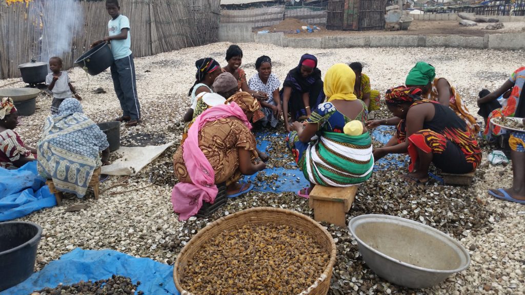 Now, the rapid expansion of fishmeal factories and freezing plants for these coastal fish (mainly sardinella) is increasing overfishing and creating competition between traditional fishmongers and women processors over local catches.[2] On top of that, noxious fumes and toxic waste dumping by these factories are exacerbating environmental problems and undermining local tourist economies.[3] Fishing and shellfish resources are also very much affected by the depletion of fish resources due to demand for fishmeal as well as by the effects of climate change, specifically, sea level rise and coastal erosion. These climate impacts have also pushed many men to leave their villages to work in urban areas or to migrate, often illegally, to European countries. This situation reinforces the hardships of women, who find themselves alone facing many difficulties due to the climate and economic crises.